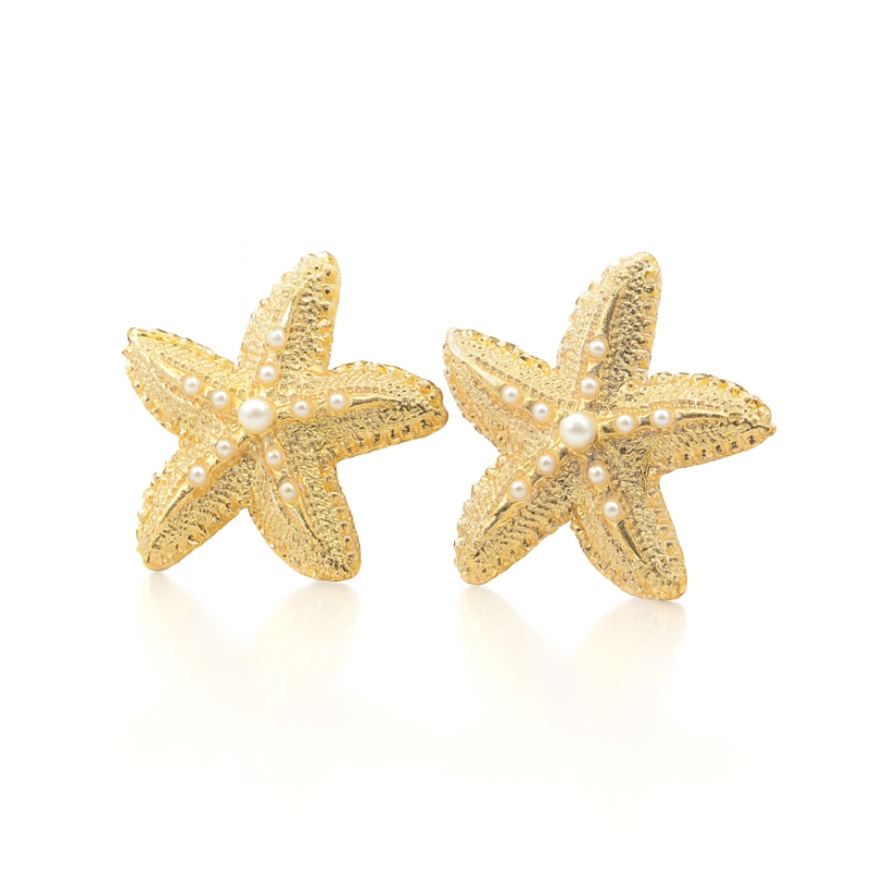 Aretes de inspiración marina con diseño de estrella de mar, elaborados en base de cobre con baño de oro y acabado rodinado (Covergold).