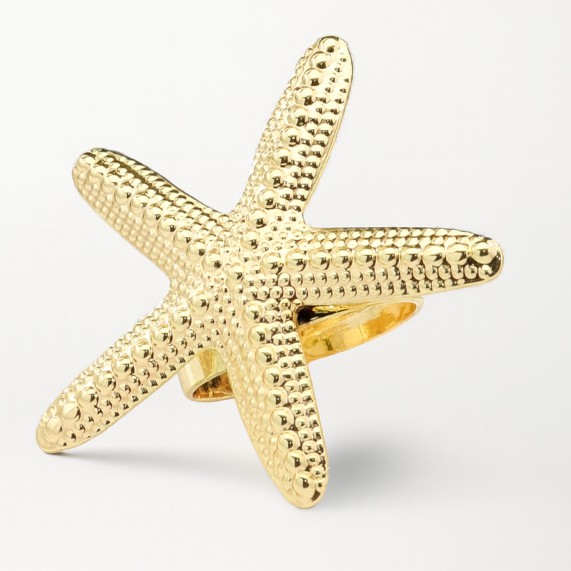 Anillo de diseño inspirado en la estrella de mar, elaborado en base de cobre con baño de oro y acabado rodinado (Covergold).