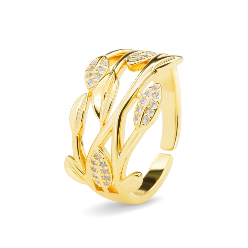 Anillo de diseño inspirado en hojas delicadas, elaborado en base de cobre con baño de oro y acabado rodinado (Covergold).