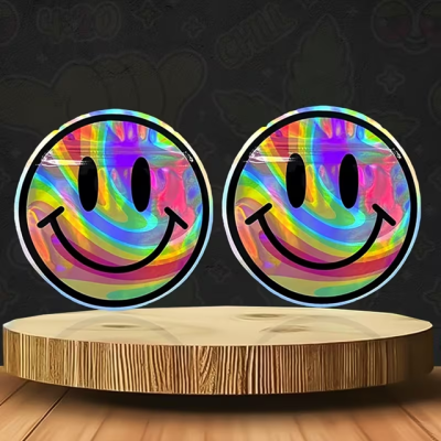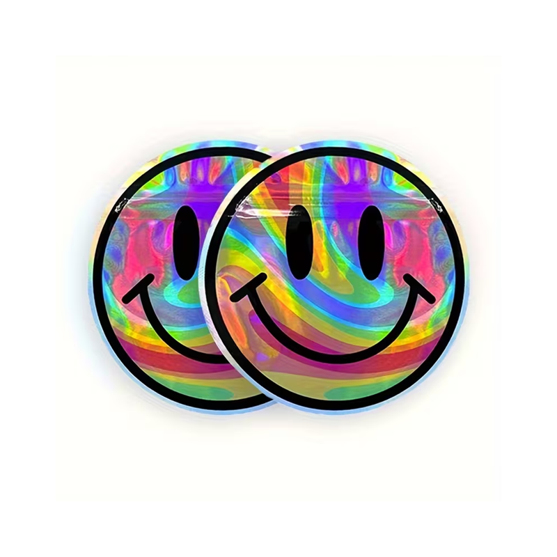 Dale un toque divertido y moderno a tu empaque con nuestra bolsa hermética redonda tornasol con diseño de cara sonriente. Su acabado holográfico multicolor crea un efecto brillante y llamativo que cambia según la luz, convirtiéndola en el centro de atención en cualquier vitrina o exhibición.